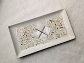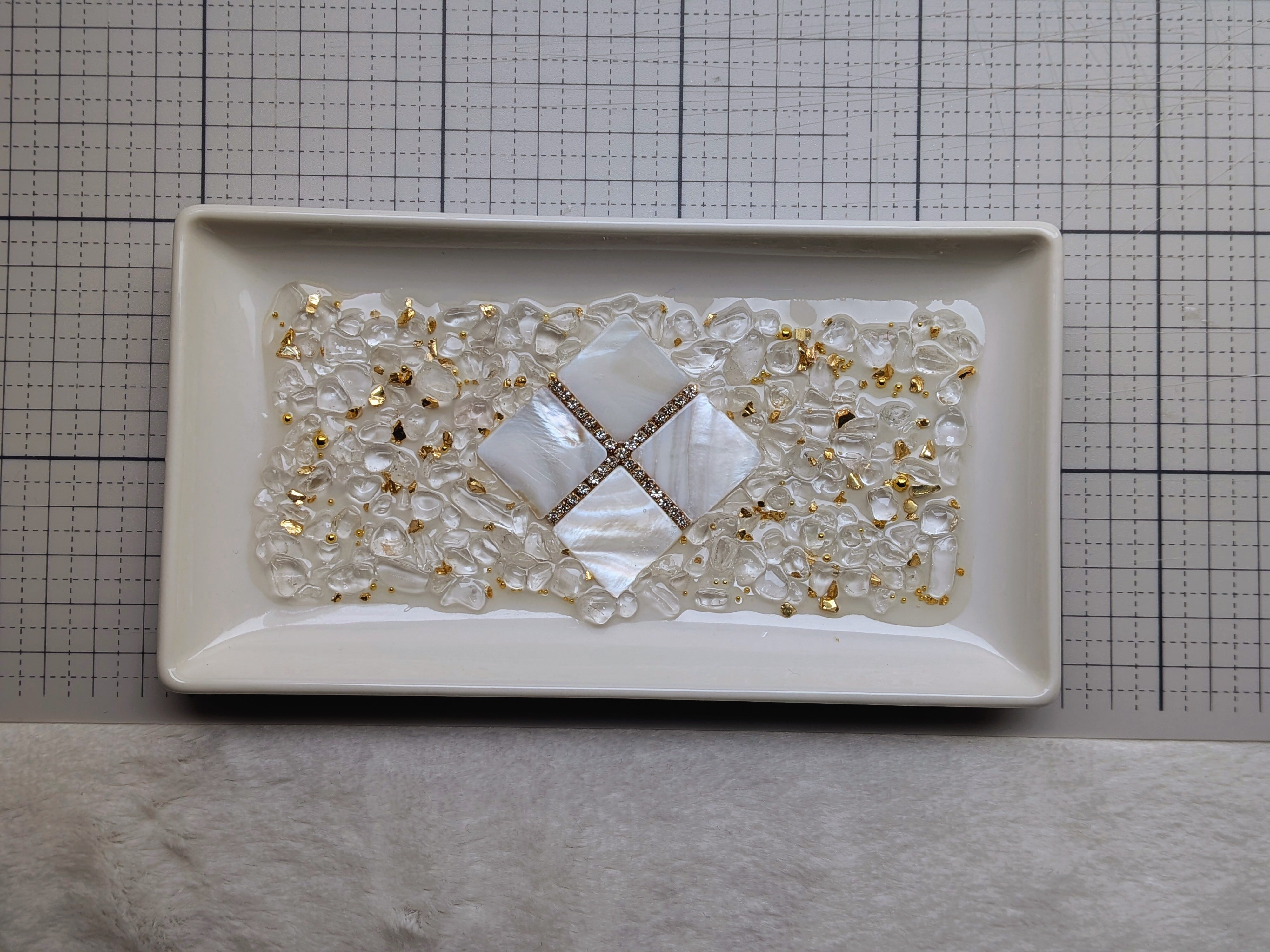 このアクセサリートレイ★長方形は、魅力的な陶器のデザインにシェルのブロックとAAAAAランクの水晶を使用した美しい一品です。トレイの中には浄化の水晶(さざれ)が煌めき、あなたの大切なアクセサリーを優しく浄化してくれます✨️